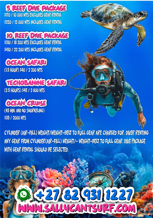 Scuba diving Ponta do oURO | mOZAMBIQUE Scuba divingPonta do ouroMOZAMBIQUE Enquiry Form Please enable JavaScript in your browser to complete this form.Name *Contact Number *Email *Number of guests *Arrival Date *Departure Date *I am interested in *Single DiveShark Dive5 Dive Package10 Dive PackageFull Kit RentalRefresherDiscover Scuba Course (resort course)Open Water One CourseOcean SafarisSardine RunSnorkeling TripsSunset CruiseAccommodationCommentsSubmit Contact Info Sally can’t Surf contact details:Corner of South Road and Lighthouse RoadPonta Do OuroMozambiquebookings@sallycantsurf.comTel +27 82 931 1227 (WhatsApp preferred)Tel +258 84 675 6327 Directions